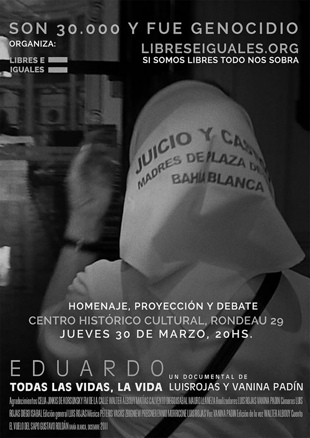 El jueves 30 de marzo se realizó la proyección del documental realizado por Luis Rojas y Vanina Padín, oportunidad para homenajear a Celia Korsunsky, y también para reflexionar colectivamente sobre el terrorismo de Estado, la necesidad de afirmar una vez más SON 30.000 Y FUE GENOCIDIO, también sobre la realidad actual y el proyecto político de nuestros desaparecidos. Por otro lado, en este marzo dedicado por Libres e iguales a las mujeres propiciando publicar notas escritas por ellas, la presentación estuvo a cargo de Viviana Rosas, Vanina Padín y Laura García Vázquez. La invitación a la actividad decía lo siguiente:"En el marco de los 41 años del golpe cívico militar de 1976 y los 40 años de la desaparición de Rodolfo Walsh, proponemos mirar y reflexionar juntos sobre " TODAS LAS VIDAS, LA VIDA, Historia de Eduardo Korsunsky " documental protagonizado por Celia Korsunsky, madre de Eduardo y sintetizado su sentido en la expresión de su realizador Luis Rojas: "Documental hecho desde el corazón para Eduardo, para los 30 mil, para Celia, para todas las madres."Entendemos esta acción como una contribución a la necesaria unidad de diferentes organizaciones en el sentido de defensa de nuestra historia ante quienes quieren borrarla, del homenaje a la generación revolucionaria que representan nuestros 30.000 desaparecidos, mucho más allá de sus pertenencias partidarias y de la necesidad de hacernos cargo del trabajo pendiente de construir una sociedad libre y justa para todos." Celia Jinkins de Korsusnsky, nuestra querida madre homenajeada, escribió en ocasión del estreno de 30.000 mariposas, el 4 de junio de 2010:"...30.000 jóvenes pensantes, solidarios, diezmada por haber soñado con la transformación del país, hermosos hombres y mujeres que pedían más justicia para el que nada tiene, por haber amado a su Patria, por haber amado a la Argentina de los desposeídos. Latidos y voces, murmullos de rebeldía de una generación de luchadores: mariposas blancas, amarillas, rojas en el compromiso de cambiar la vida, los arrojaron al horror, pretendiendo que el silencio y el olvido los protegiera pero las madres ya estábamos caminando el país, golpeando puertas, gritando nuestros pesares. Como también lo hicimos aquí en nuestra ciudad, fue difícil; marchas, actos, debates, explicaciones en las esquinas, pero por cierto acompañadas por grupos de jóvenes , fortaleciéndonos mutuamente, en esta tarea."